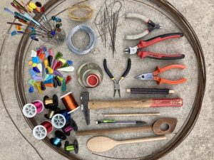 Je dessine avec le fil de fer des formes légères et délicates ,qui jouent avec le vent , auxquelles j’ajoute de la couleur avec des touches de verre, de fils de cuivre et de tissus.