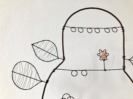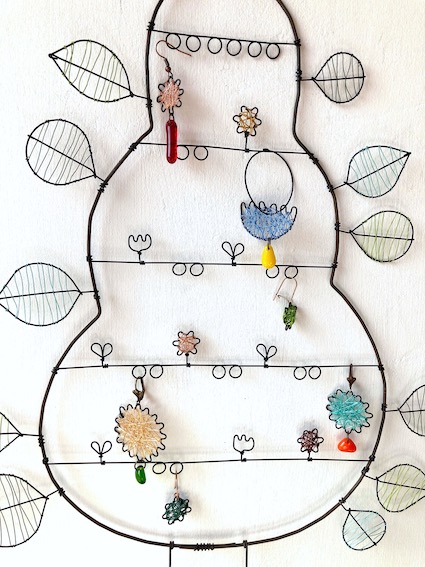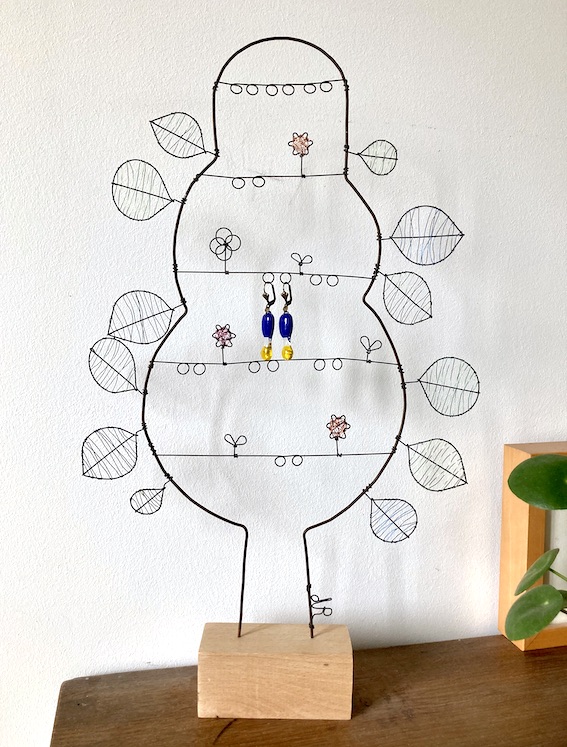 Porte boucles d’oreille et autres bijoux en fil de fer recuit avec éléments en fils de cuivre sur pied en bois