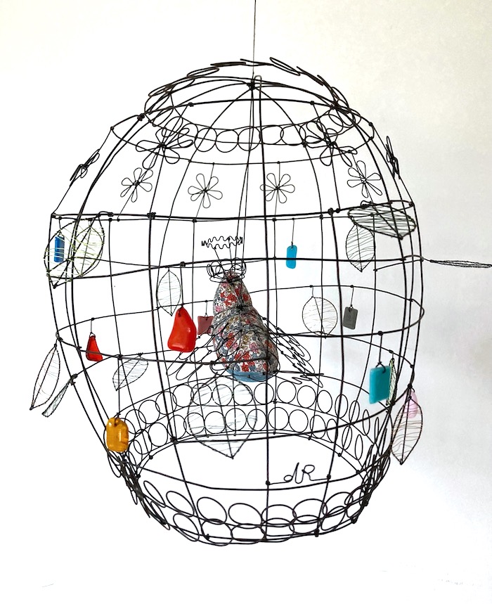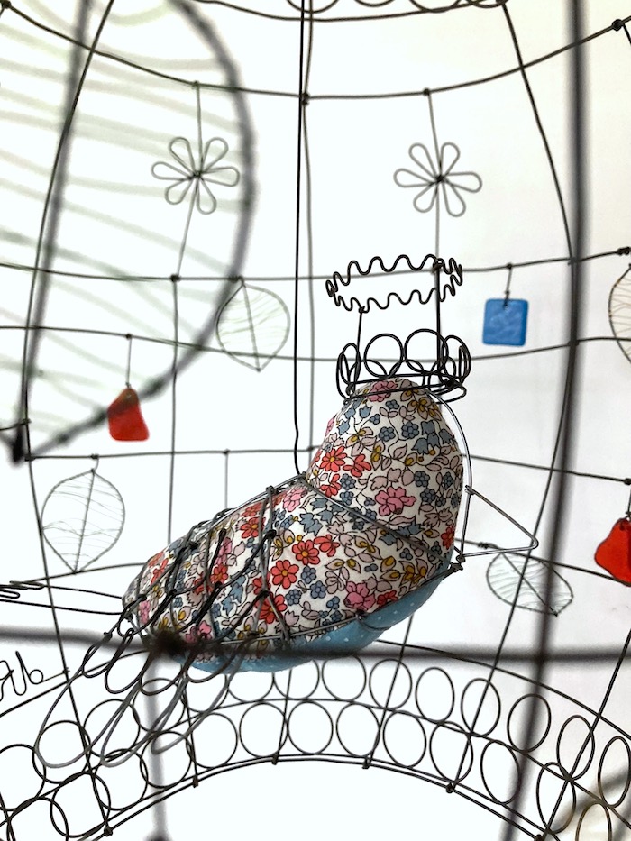 Cage oiseau ronde en fil de fer recuit avec un oiseau en tissu Liberty , des fils de cuivre et des éléments en verre