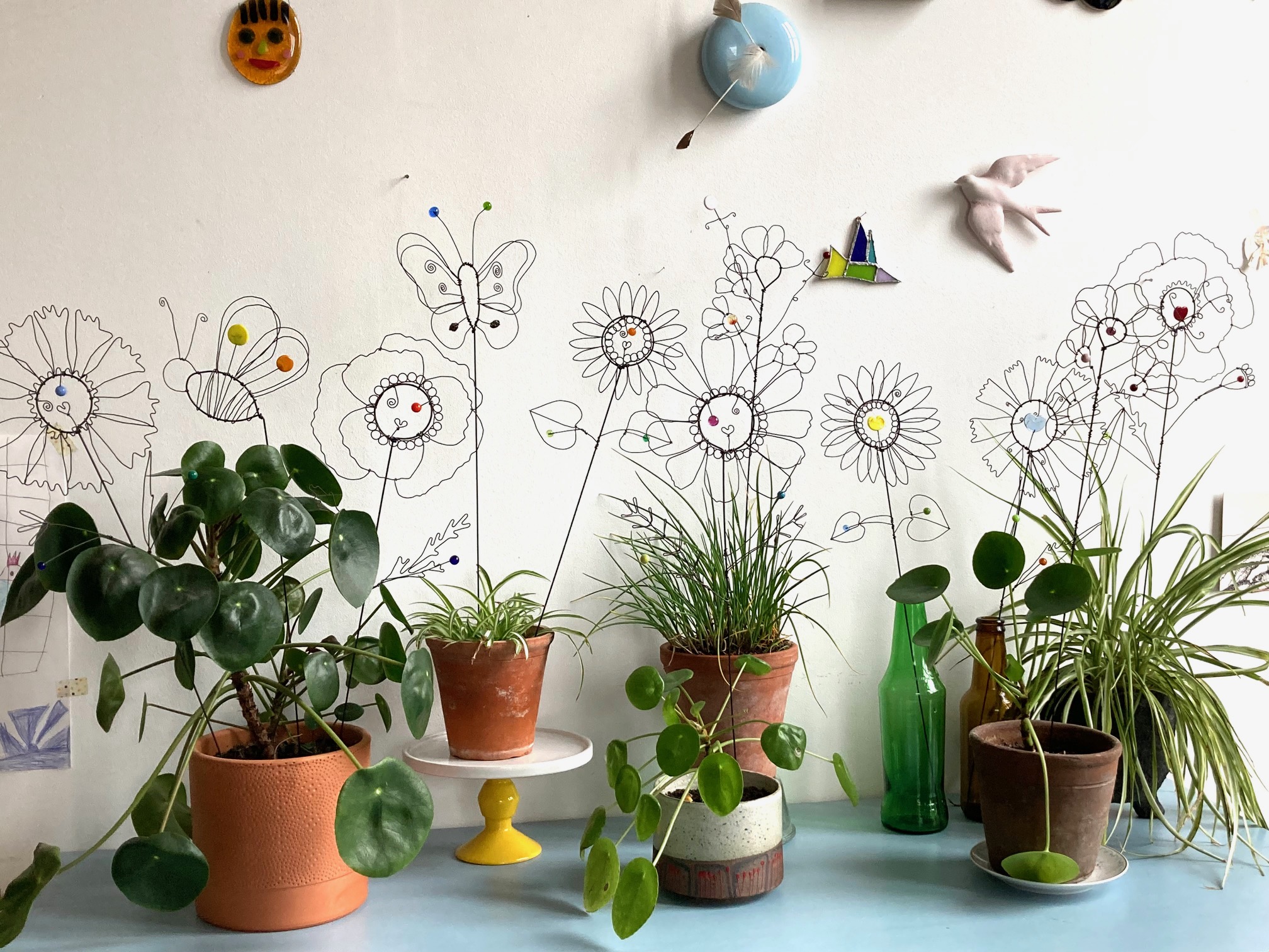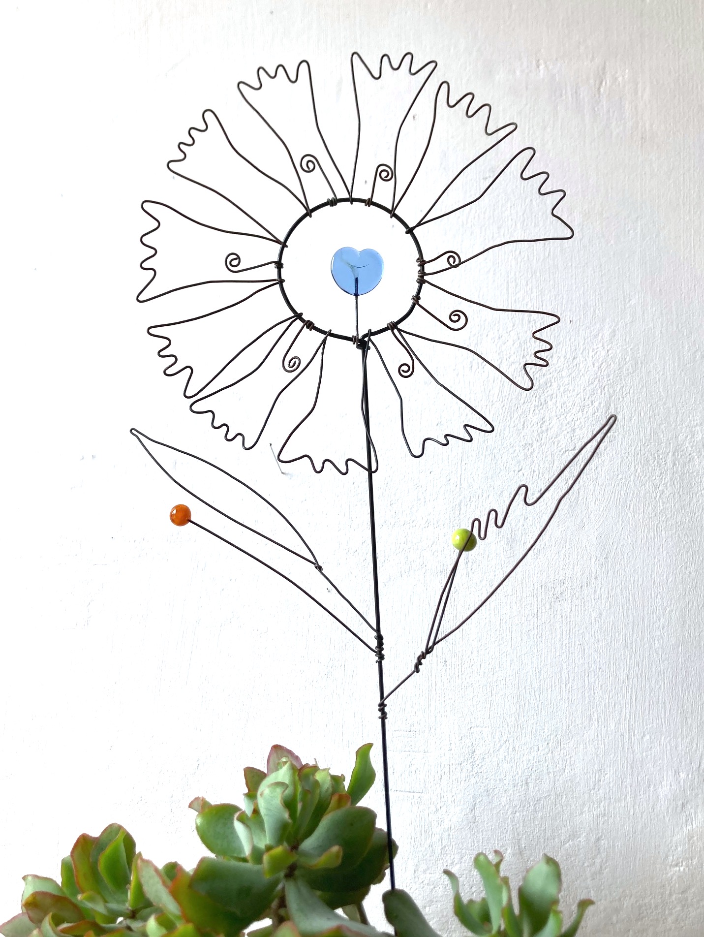 Fleur à planter Bleuet coeur en fil de fer recuit avec éléments en verre