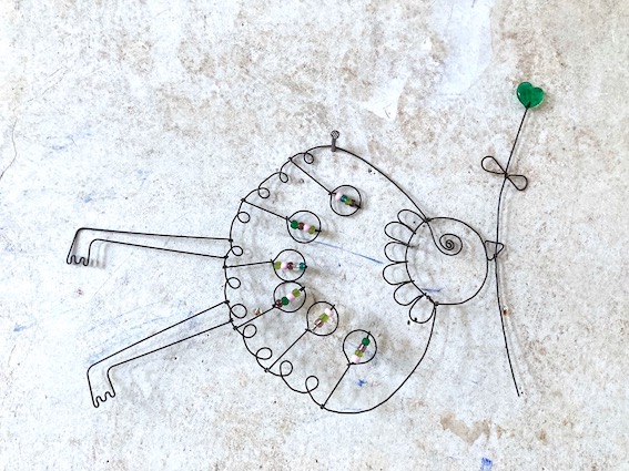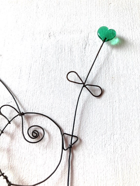 Petit oiseau en fil de fer recuit avec perles et coeur en verre