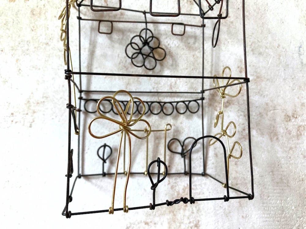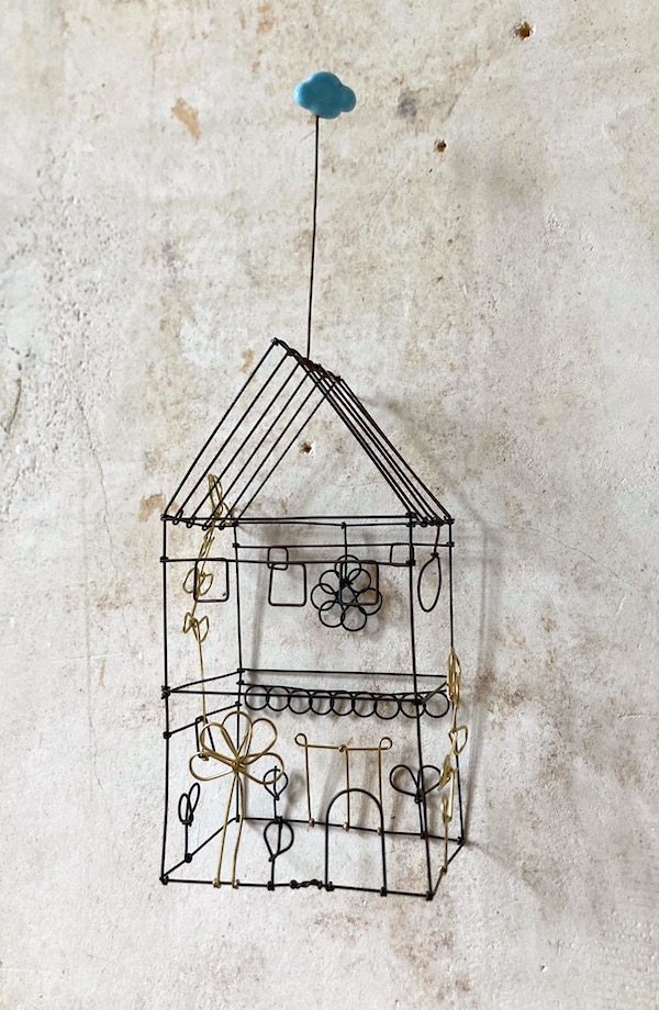 Petite maison dorée en fil de fer recuit avec fils de cuivre et élément nuage en verre