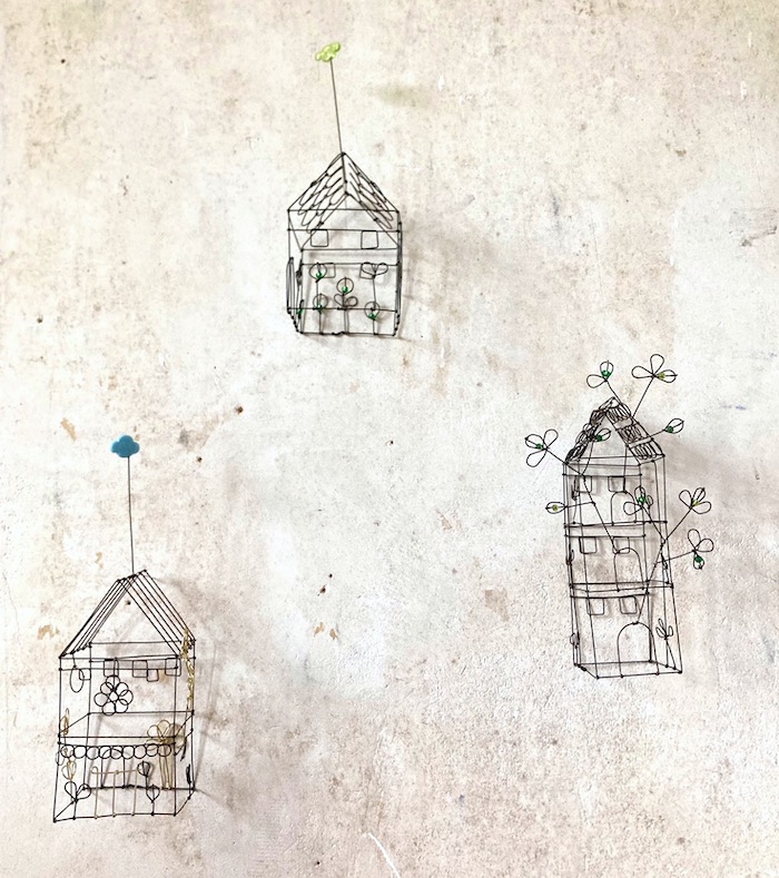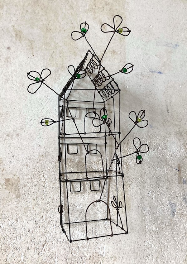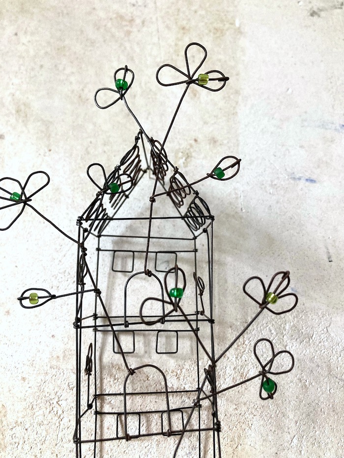 Petite maison haute en fil de fer recuit avec branches et perles en verre